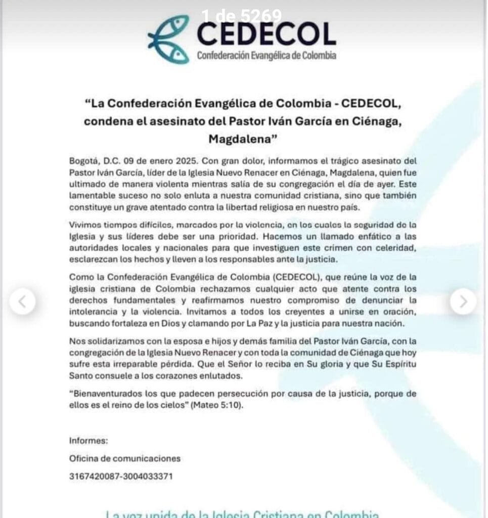 La Confederación Evangélica de Colombia (Cedecol) emitió un comunicado condenando el asesinato del pastor García.